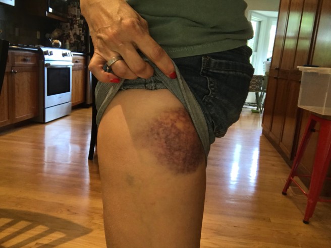 DO NOT LOOK if you are squeamish about bruises, middle-aged thighs or if you have 20-year-old thighs and want to enjoy your denial that they will never be 46-year-old thighs OR if you think viewing my injury will irreparably damage our relationship forever.